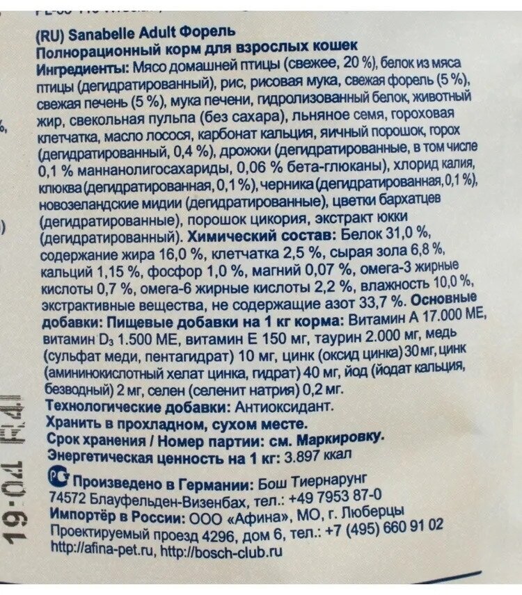 | Состав | свежее мясо домашней птицы (мин. 20 %), рис, просо жёлтое, животный жир, мука из форели (мин. 5 %), картофельный белок, печень (дегидратированная), мука из мяса домашней птицы, гидролизованный белок, подкожная клетчатка (дегидратированная), мясная мука, рыбная мука, пульпа свёклы (без сахара), целлюлоза, льняное семя, яичный порошок, дрожжи (дегидратированные), рыбий жир, хлорид калия, клюква (дегидратированная), черника (дегидратированная), мука из мидий, порошок цикория, цветки бархатцев (дегидратированные), экстракт юкки |