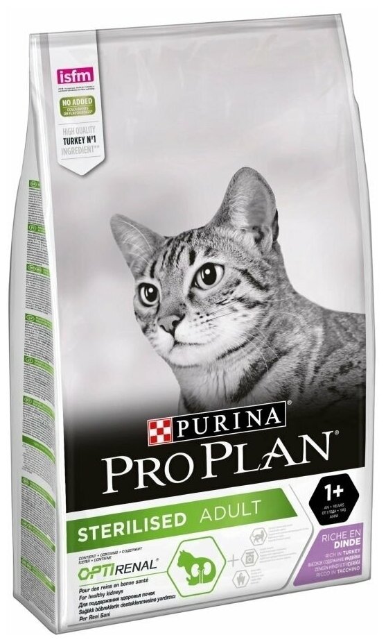 Сухой корм Purina Pro Plan Sterilised для взрослых стерилизованных кошек и кастрированных котов, с индейкой, 10 кг