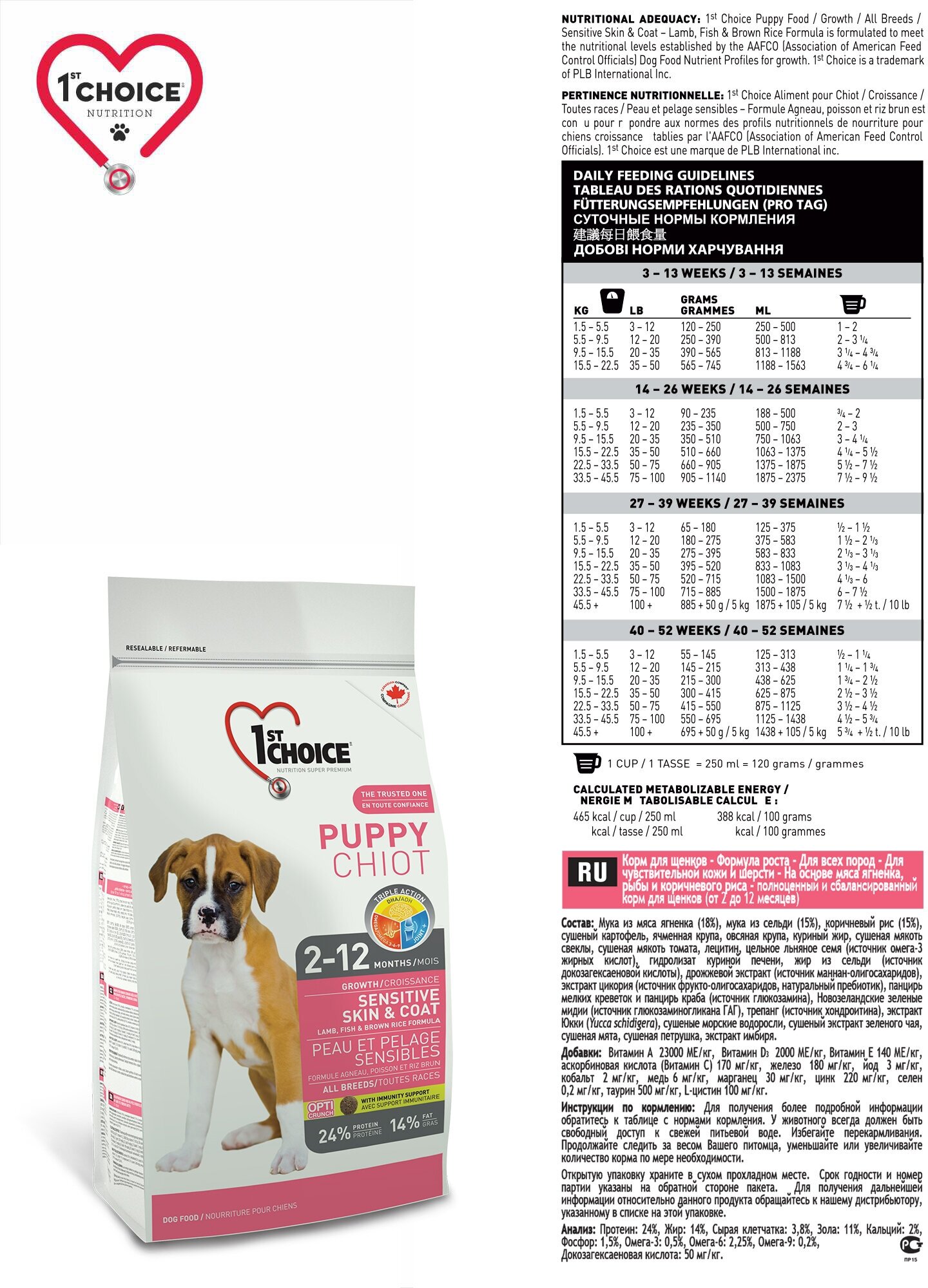 1ST CHOICE PUPPY ALL BREEDS SENSITIVE SKIN & COAT для щенков всех пород при аллергии с ягненком, рыбой и рисом (2,72 кг)