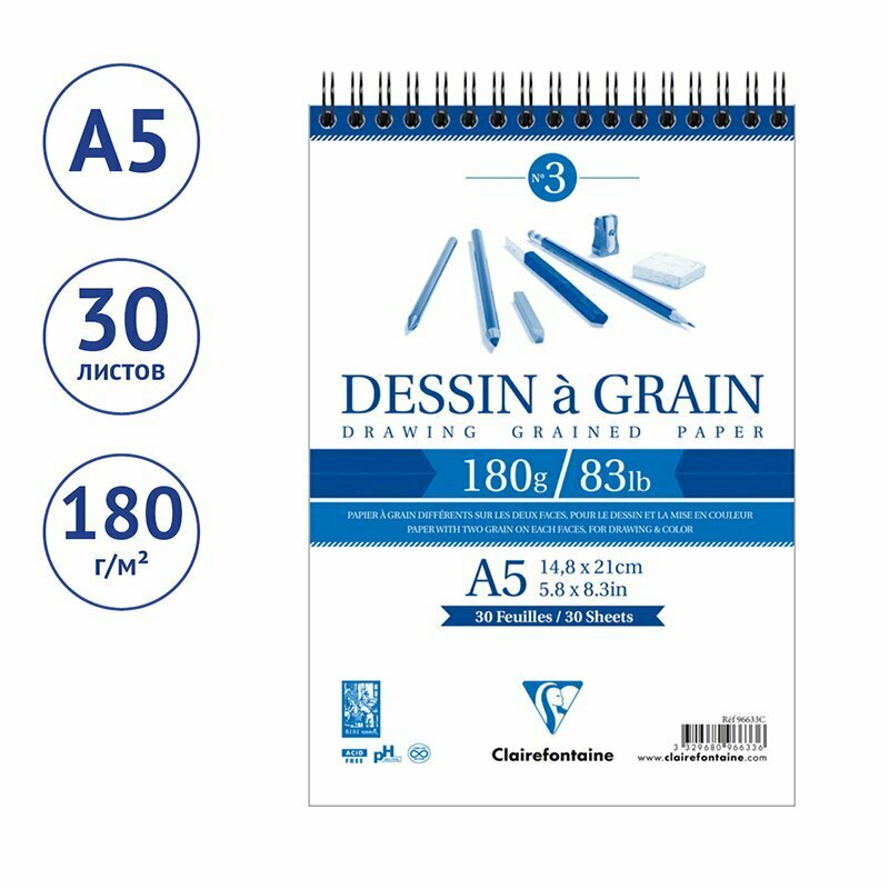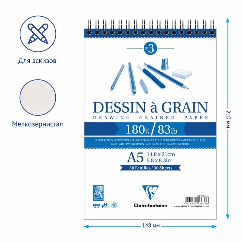Скетчбук 30л., А5 Clairefontaine Dessin a grain, на гребне, 180г/м2, мелкозернистая ( Артикул 320104 )