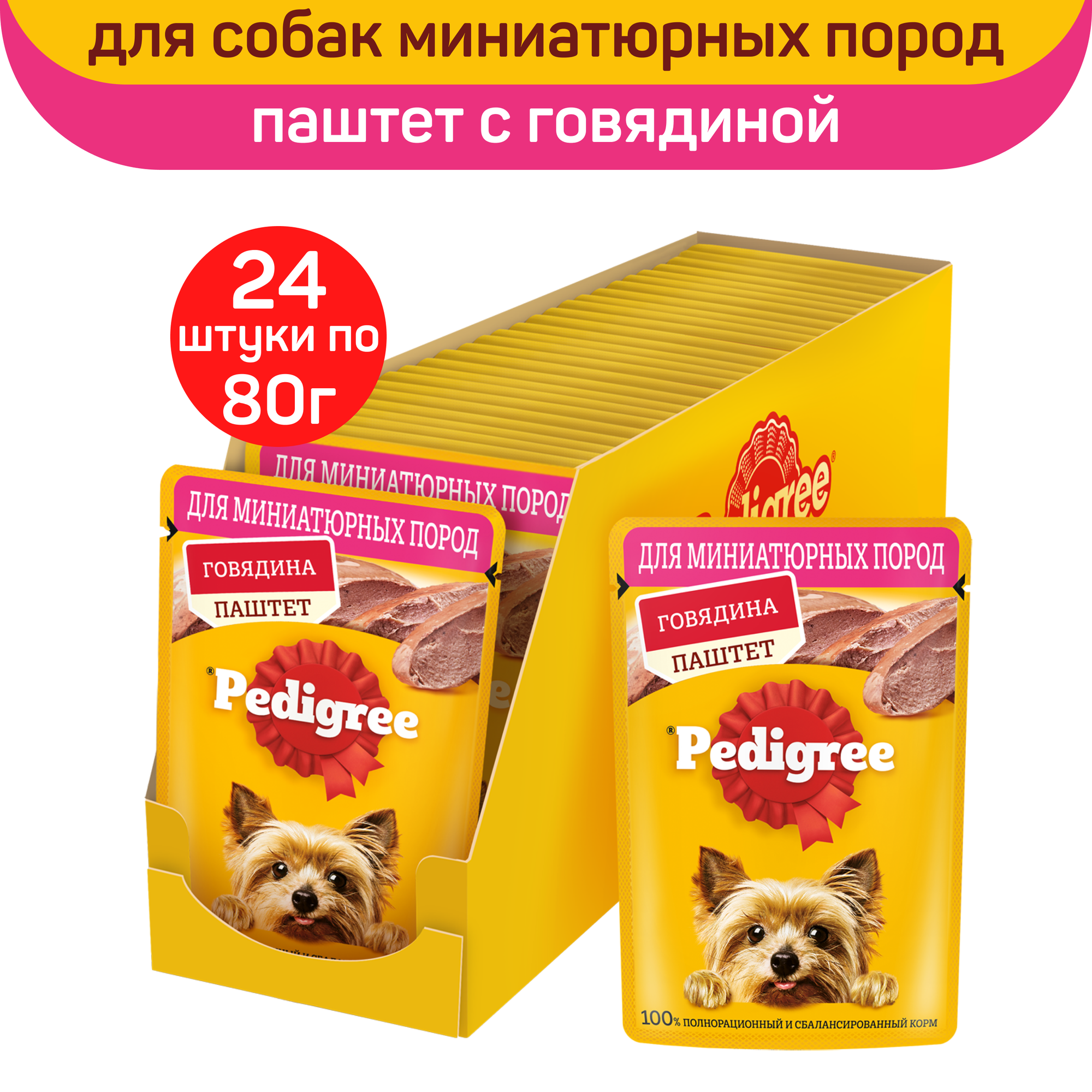 Влажный корм Pedigree для взрослых собак миниатюрных пород, паштет с говядиной, 80г х 24шт