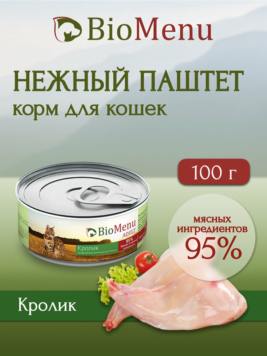 BioMenu ADULT Консервы для кошек мясной паштет с Кроликом 95%-мясо 100г (24шт)
