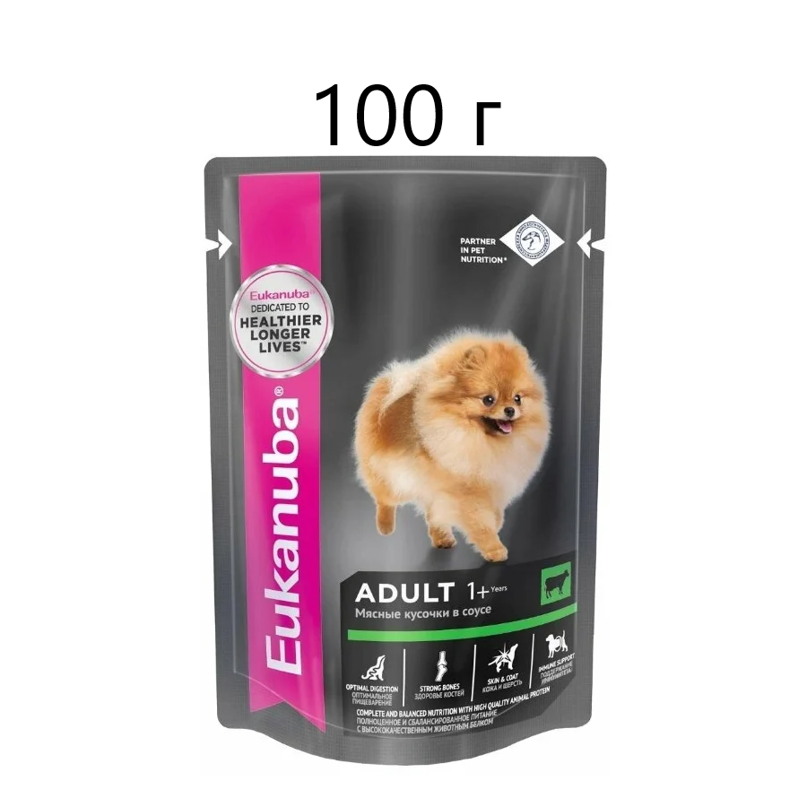 Влажный корм для собак Eukanuba Adult 1+ years, для здоровья кожи и шерсти, c говядиной, 100 г (кусочки в соусе)