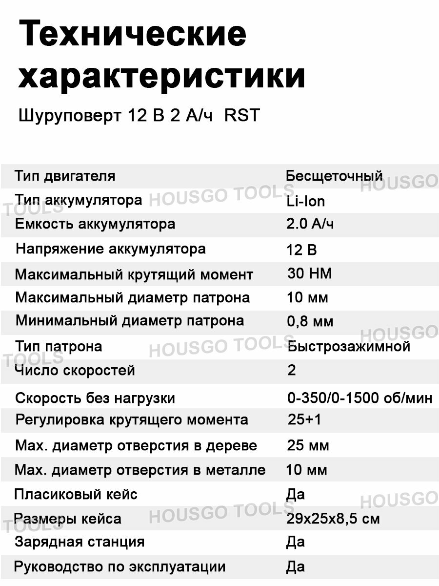 | Подробная комплектация | - Шуруповерт бесщеточный 21V - 1 шт; - Литий-ионные акб 2Ач - 2 шт; - Зарядная станция - 1 шт; - Ударопрочный вместительный кейс - 1 шт; - Бумажная инструкция на русском языке - 1 шт; |