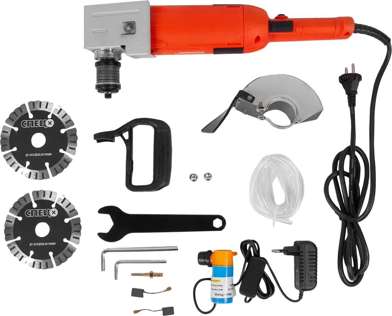 | Комплектация | штроборез 1 шт, алмазный диск 2 шт, D-рукоятка 1 шт, водяная помпа 1 шт, ключи для замены диска (комплект) 1 шт, щетки электрические (комплект) 1 шт, коннектор для шланга 1 шт, инструкция 1 шт |