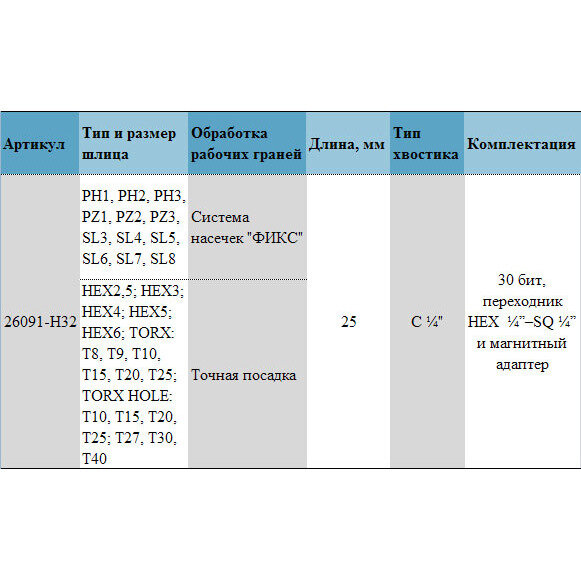 | Биты подробно | PH1, PH2, PH3, PZ1, PZ2, PZ3, SL3, SL4, SL5, SL6, SL7, SL8, T8, T9, T10, T15, T20, T25, HEX2.5, HEX3, HEX4, HEX5, HEX6, TR10, TR15, TR20, TR25, TR27, TR30, TR40 |