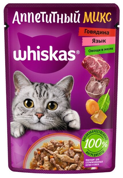 Купить Whiskas Аппетитный микс влажный корм для взрослых кошек, с говядиной, языком и овощами в желе, в паучах - 75 г х 28 шт