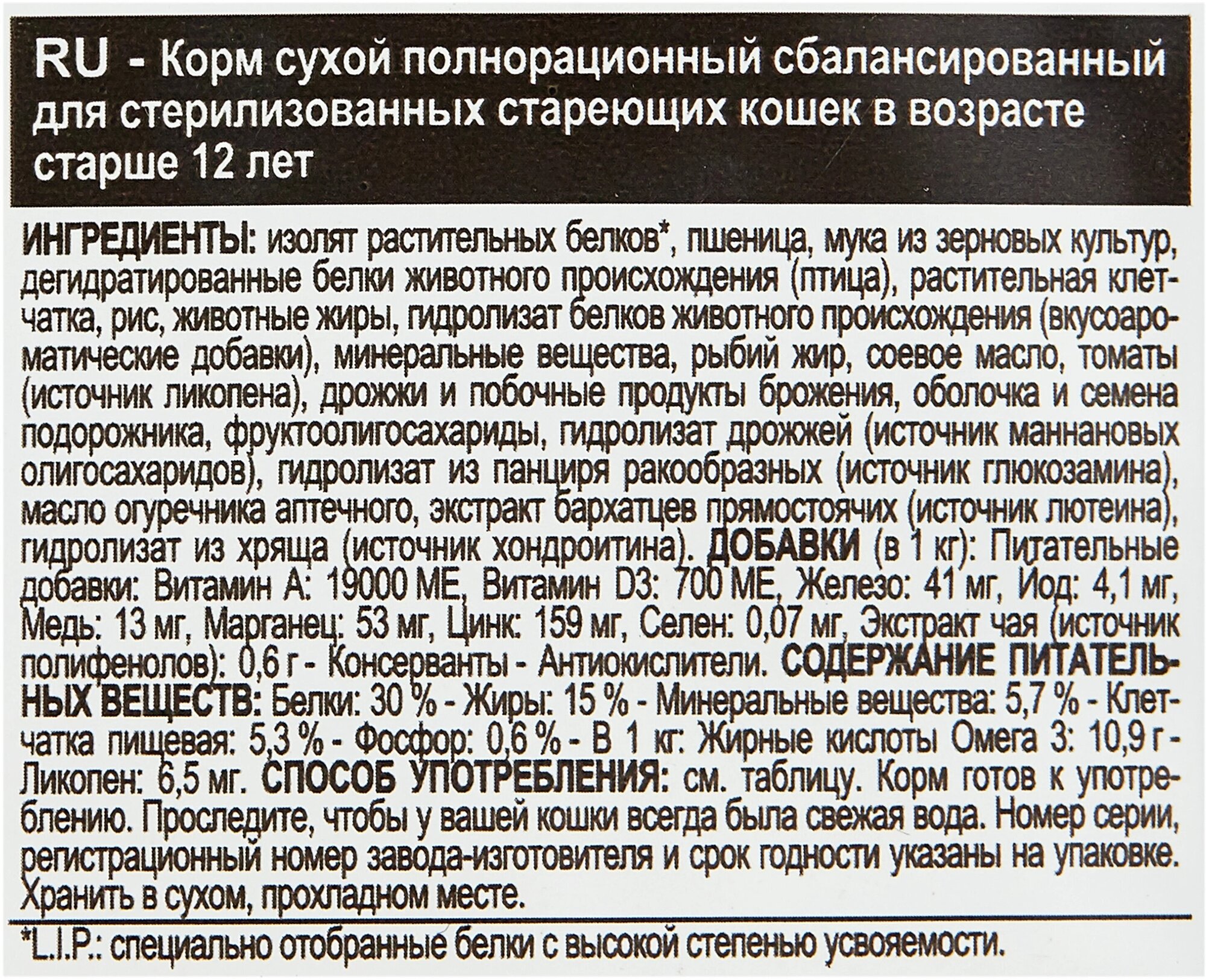 | Состав | изолят растительных белков, пшеница, мука из зерновых культур, дегидратированные белки животного происхождения (птица), растительная клетчатка, рис, животные жиры, гидролизат белков животного происхождения (вкусоароматические добавки), минеральные вещества, рыбий жир, соевое масло, томаты (источник ликопина), дрожжи и побочные продукты брожения, оболочка и семена подорожника, фруктоолигосахариды, гидролизат дрожжей (источник мaннановых олигосахаридов), гидролизат из панциря ракообразных (источник глюкозамина), масло огуречника аптечного, экстракт бархатцев прямостоячих (источник лютеина), гидролизат из хряща |