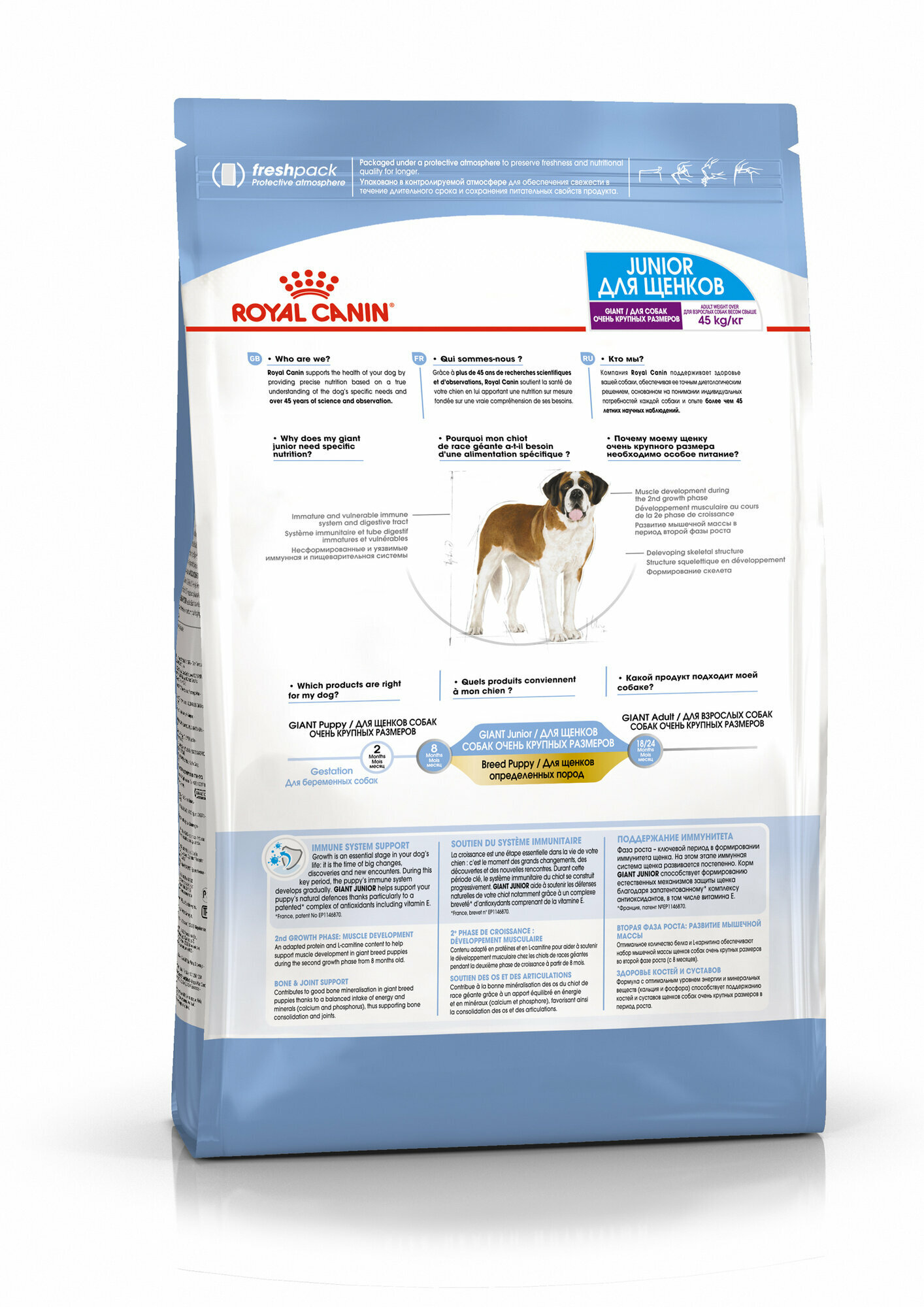 | Дополнительная информация | 1) поддержание иммунитета: Фаза роста – ключевой период в формировании иммунитета щенка. На этом этапе иммунная система щенка развивается постепенно. Корм Giant Junior способствует формированию естественных механизмов защиты щенка благодаря запатентованному* комплексу антиоксидантов, в том числе витамина Е; 2) вторая фаза роста: развитие мышечной массы: Оптимальное количество белка и L-карнитина обеспечивают набор мышечной массы щенков собак очень крупных размеров во второй фазе роста (с 8 месяцев); 3) здоровье костей и суставов: Формула с оптимальным уровнем энергии и минеральных веществ (кальция и фосфора) способствует поддержанию костей и суставов щенков собак очень крупных размеров в период роста |