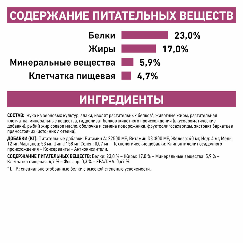 | Состав | мука из зерновых культур, злаки, изолят растительных белков*, животные жиры, растительная клетчатка, минеральные вещества, гидролизат белков животного происхождения (вкусоароматические добавки), рыбий жир, соевое масло, оболочка и семена подорожника, фруктоолигосахариды, экстракт бархатцев прямостоячих (источник лютеина); *L.I.P.: специально отобранные белки с высокой степенью усвояемости |