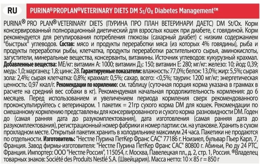 СохранитьВлажный корм для кошек Purina PRO PLAN VETERINARY DIETS DM ST/OX Diabetes Management при диабете, с говядиной, в соусе 85 г 10 шт интересное: