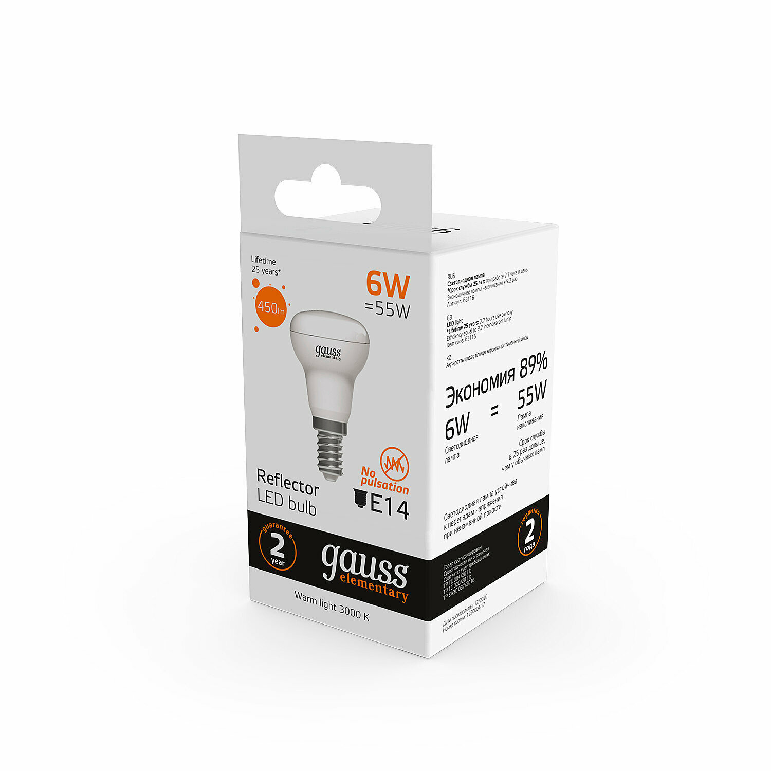 Светодиодная лампа GAUSS Elementary R50 6W 450lm 3000K Е14 LED 1/10/50