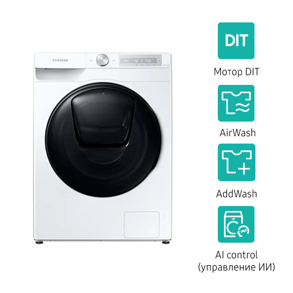 Стиральная машина Samsung WD10T654CBH/LP с сушкой, дверцей AddWash,10+7 кг, инверторным мотором, технологией Eco Bubble, обработкой паром, белая / черная