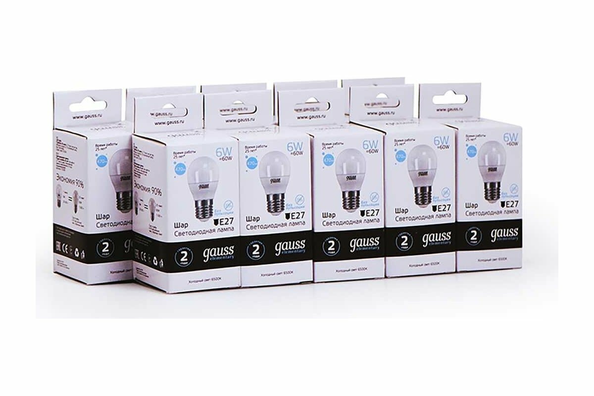 (10 шт) Лампа Gauss Elementary Шар 6W 470lm 6500K Е27 LED
