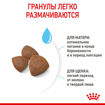 | Дополнительная информация | Start Complex/Естественные механизмы защиты; 1) здоровье пищеварительной системы: Программа Start Complex, разработанная в научных лабораториях Royal Canin, представляет собой комбинацию питательных веществ, имеющихся в сучьем молоке, усиленную дополнительными компонентами, которые обеспечивают здоровое пищеварение и укрепляют естественный иммунитет щенка; 2) поддержка в период беременности и лактации: Питательный состав адаптирован к высоким энергетическим потребностям собаки в конце беременности и в период лактации; 3) легко размачиваются: Крокеты обладают высокой вкусовой привлекательностью для собак и щенков в период отъема, а также легко размачиваются до консистенции каши, которая облегчает переход от материнского молока к твердой пище |