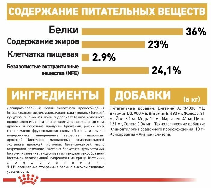 | Состав | дегидратированные белки животного происхождения (птица), рис, животные жиры, изолят растительных белков, растительная клетчатка, гидролизат белков животного происхождения (вкусоароматические добавки), пшеница, мука из зерновых культур, дрожжи и побочные продукты брожения, рыбий жир, минеральные вещества, соевое масло, фруктоолигосахариды, оболочка и семена подорожника, гидролизат дрожжей (источник мaннановых олигосахаридов), экстракты дрожжей (источник бета-глюканов), масло огуречника аптечного, экстракт бархатцев прямостоячих (источник лютеина), гидролизат из панциря ракообразных (источник глюкозамина), гидролизат из хряща (источник хондроитина) |