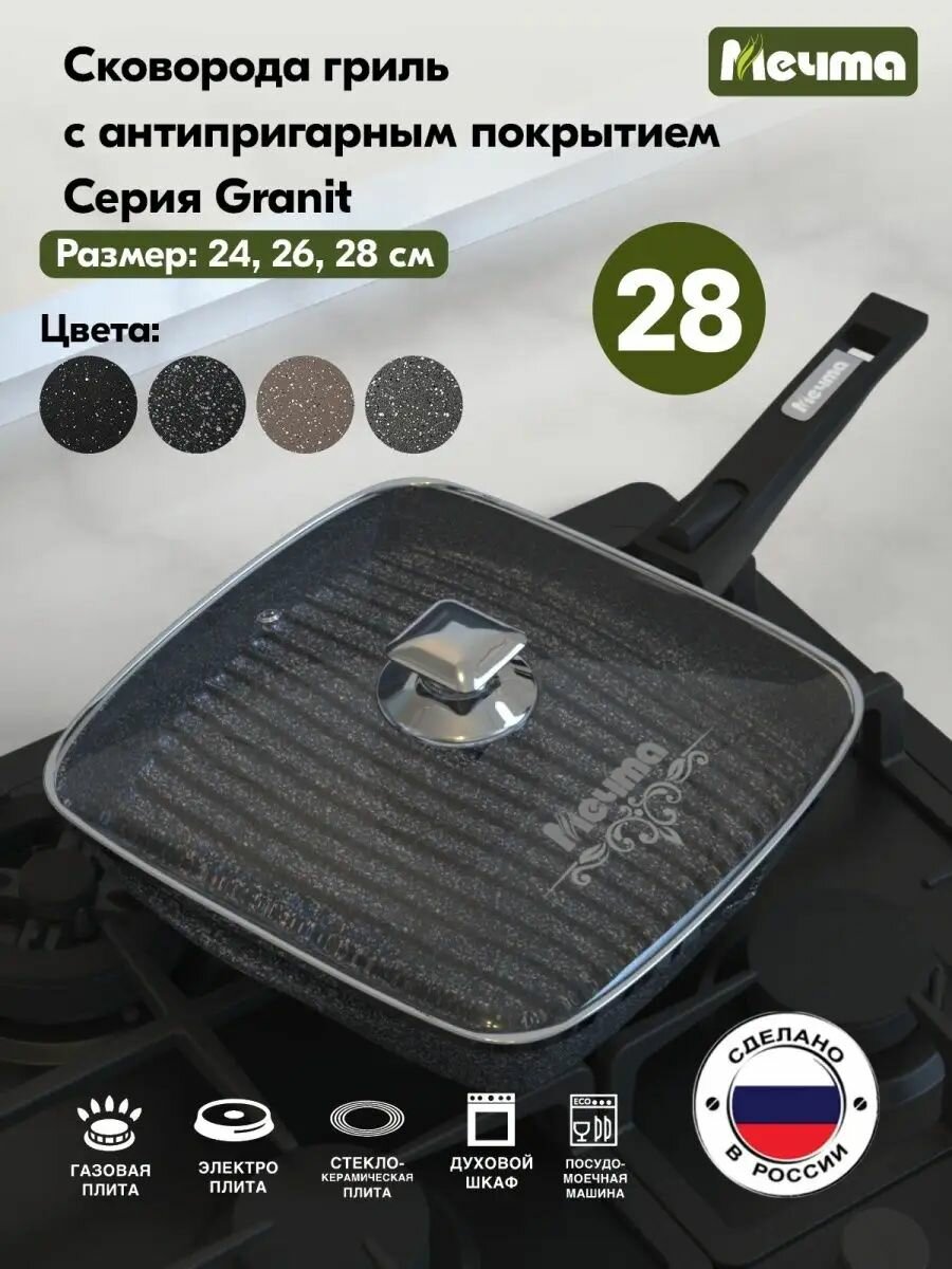 Сковорода гриль Мечта квадратная 28х28 см Гранит с антипригарным покрытием со съемной ручкой и крышкой, НЕ индукционная