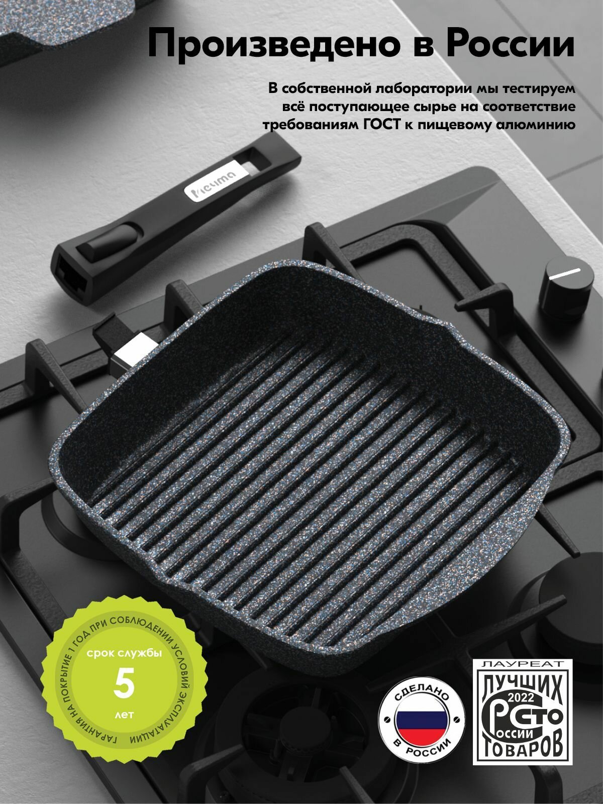 Сковорода гриль Мечта квадратная 24х24 см Гранит с антипригарным покрытием со съемной ручкой и крышкой, НЕ индукционная