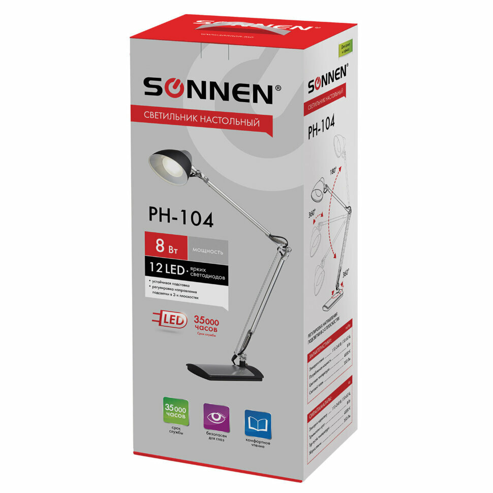 Настольная лампа-светильник SONNEN PH-104, подставка, LED, 8 Вт, металлический корпус, черный, 236690, 236690