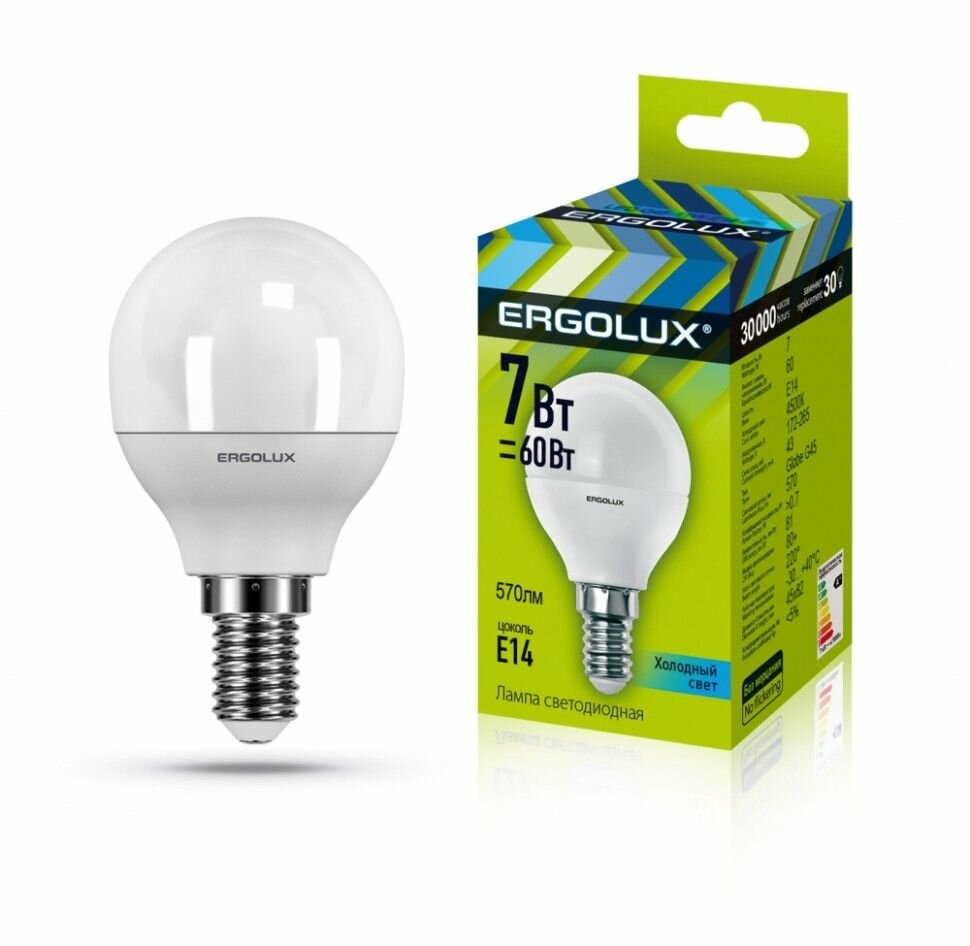 Светодиодная лампа шарик 7Вт Е14 4500К(холодный белый свет) - LED-G45-7W-E14-4K (Ergolux) (код заказа 12144 )