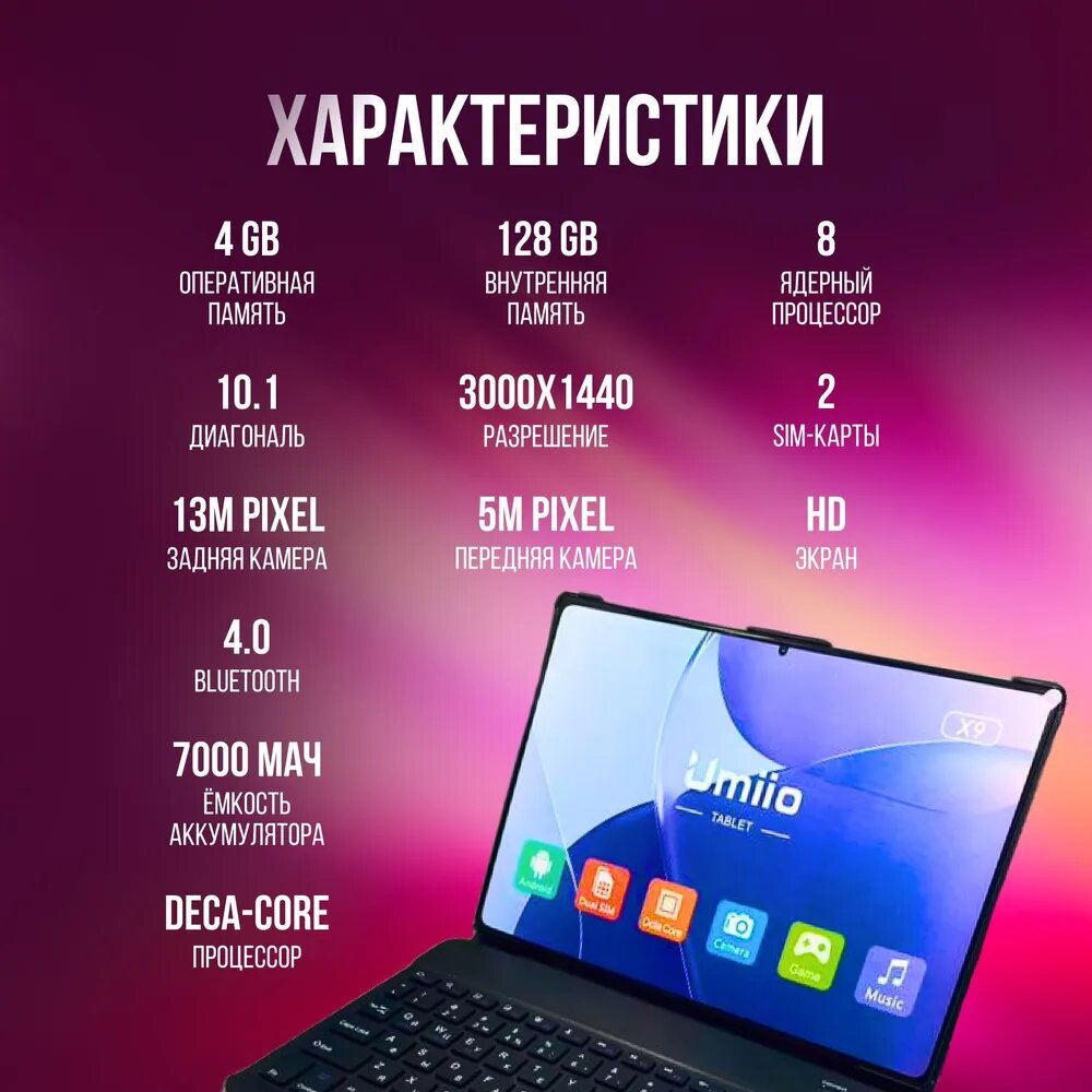 Планшет 10,1" Umiio с клавиатурой и стилусом, 6 ГБ/128ГБ, Android 11, Серебристый