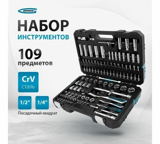 Набор инструментов, 1/4", 1/2", CrV, 120 зубьев, 109 предметов// Gross 14155