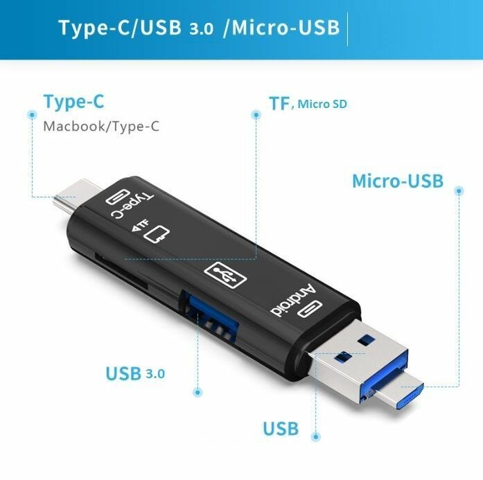 Ниже Вы можете прочитать отзывы на Картридер 5 в 1 USB 2.0, microUSB, Type-C, для карт памяти microSD TF для ноутбука, Android и телефона., ознакомится с подробными характеристиками, посмотреть интересные обзоры и фотографии на Картридер 5 в 1 USB 2.0, microUSB, Type-C, для карт памяти microSD TF для ноутбука, Android и телефона..