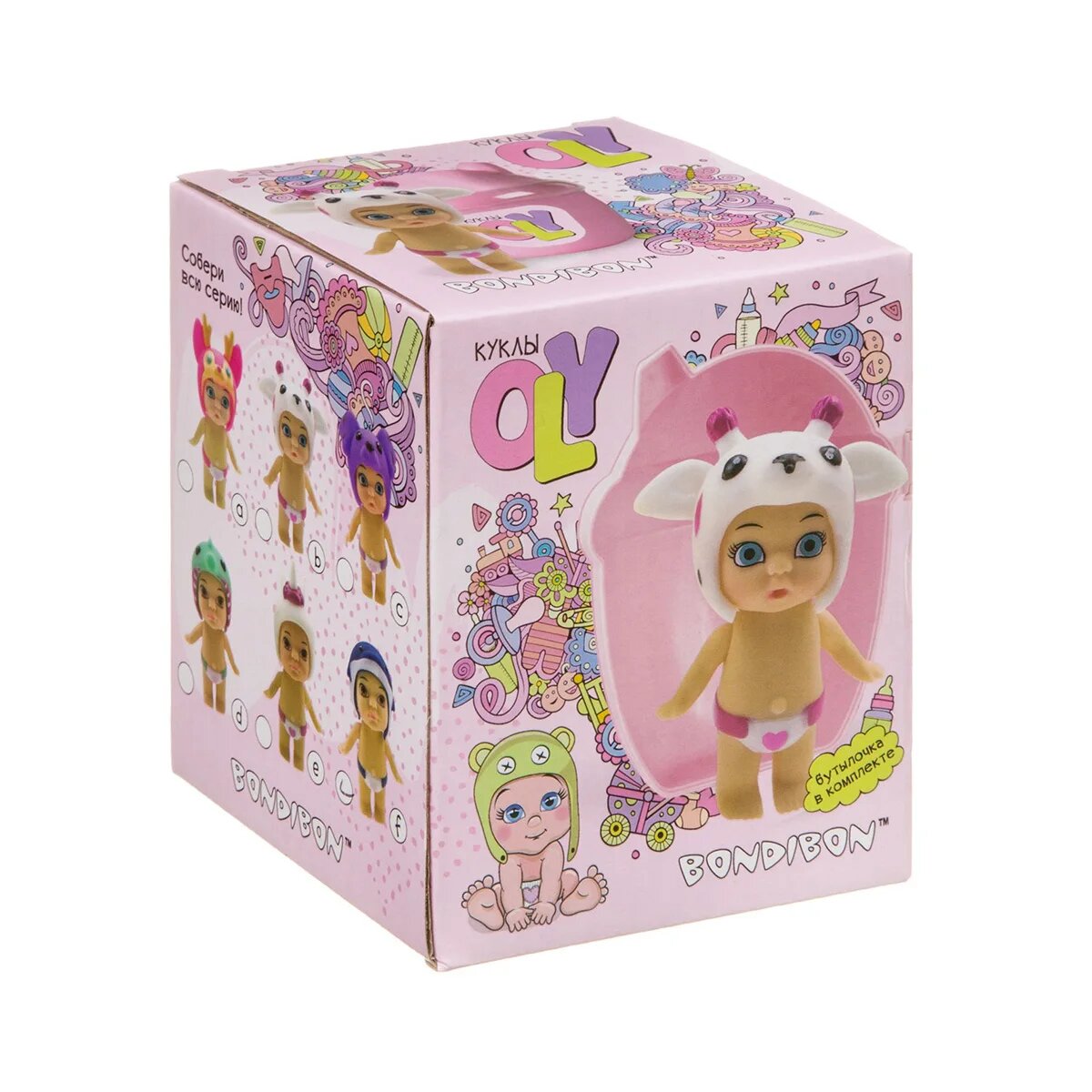 Куколка Bondibon Oly, в шапочке с животным, с аксессуарами, в поильнике (ВВ3846)
