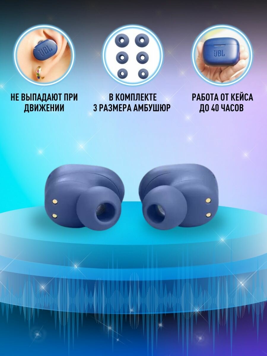 | Дополнительная информация | JBL Pure Bass Sound; технология Smart Ambient, VoiceAware - контроль уровня громкости звука при разговоре, уровня слышимости собственного голоса; мобильное приложение: JBL Headphones; работают в режиме активного шумоподавления 24 часа при подзарядке; силиконовые вкладыши; вес кейса 40.4 г; профили Bluetooth A2DP V1.3, AVRCP V1.6, HFP V1.7; модуляция передатчика Bluetooth GFSK: GFSK, π/4-DQPSK, 8-DPSK; мощность передатчика Bluetooth 0 - 12dbm; поддержка быстрой зарядки; блок питания 5В, 1А |
