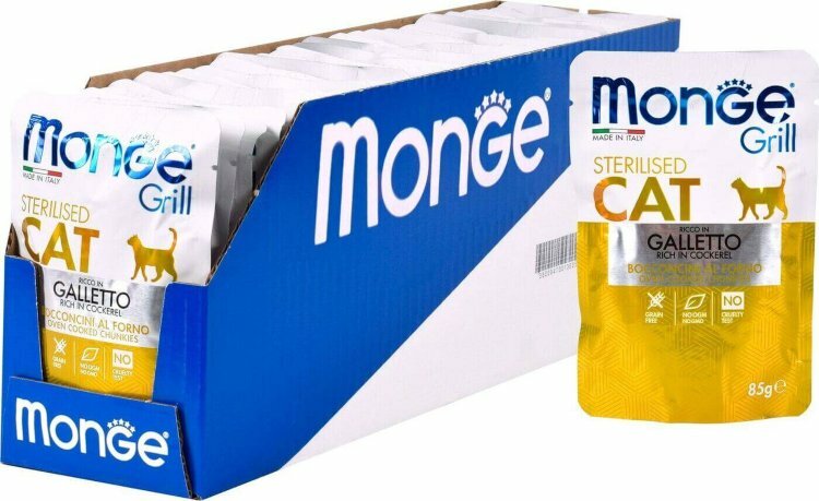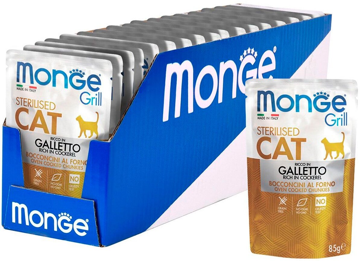 Корм для кошек MONGE Cat Grill Pouch для стерилизованных кошек итальянская курица пауч 85г (упаковка - 28 шт)