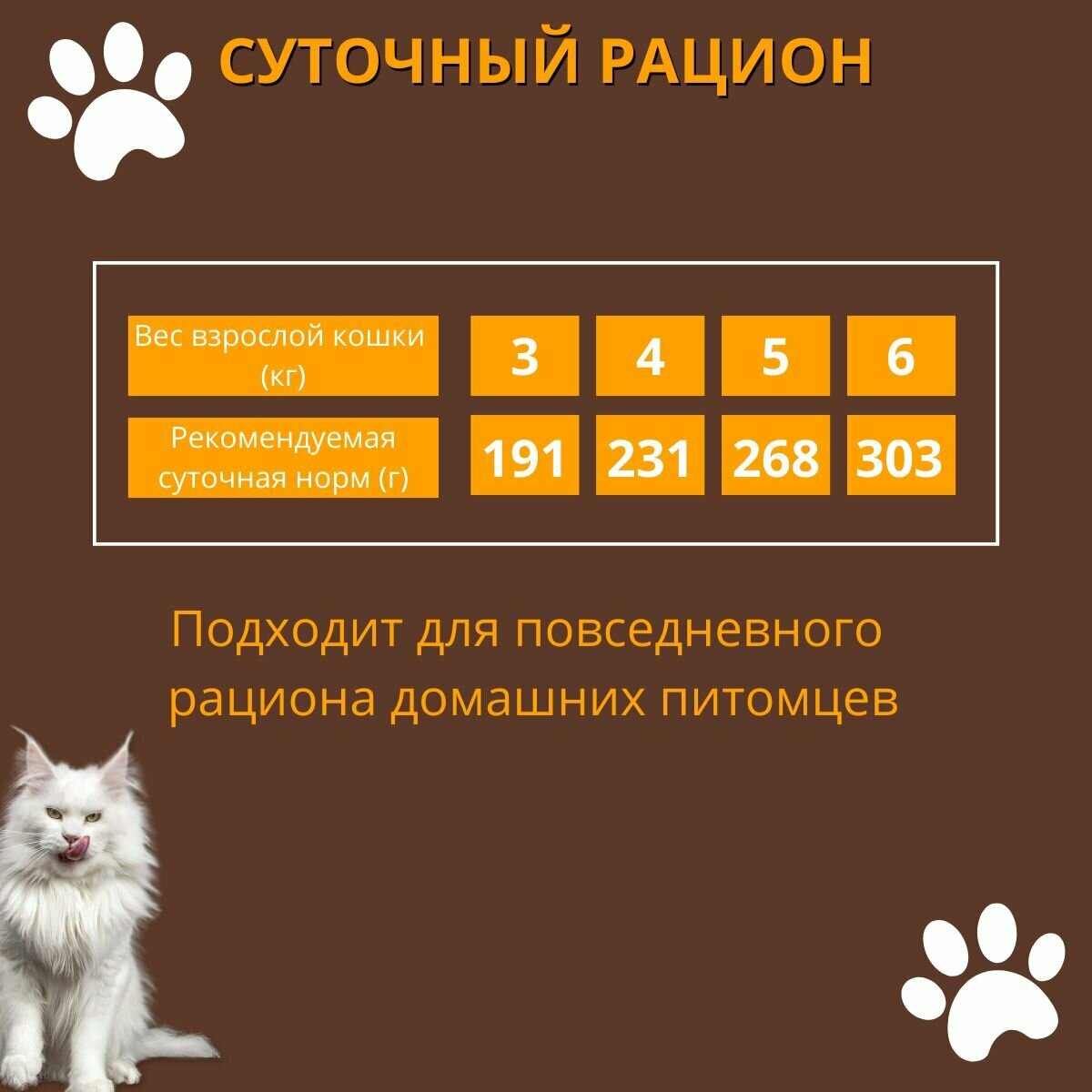 | Дозировка | - вес кошки 3 кг - 164 г - вес кошки 4 кг - 200 г - вес кошки 5 кг - 230 г - вес кошки 6 кг - 261 г |