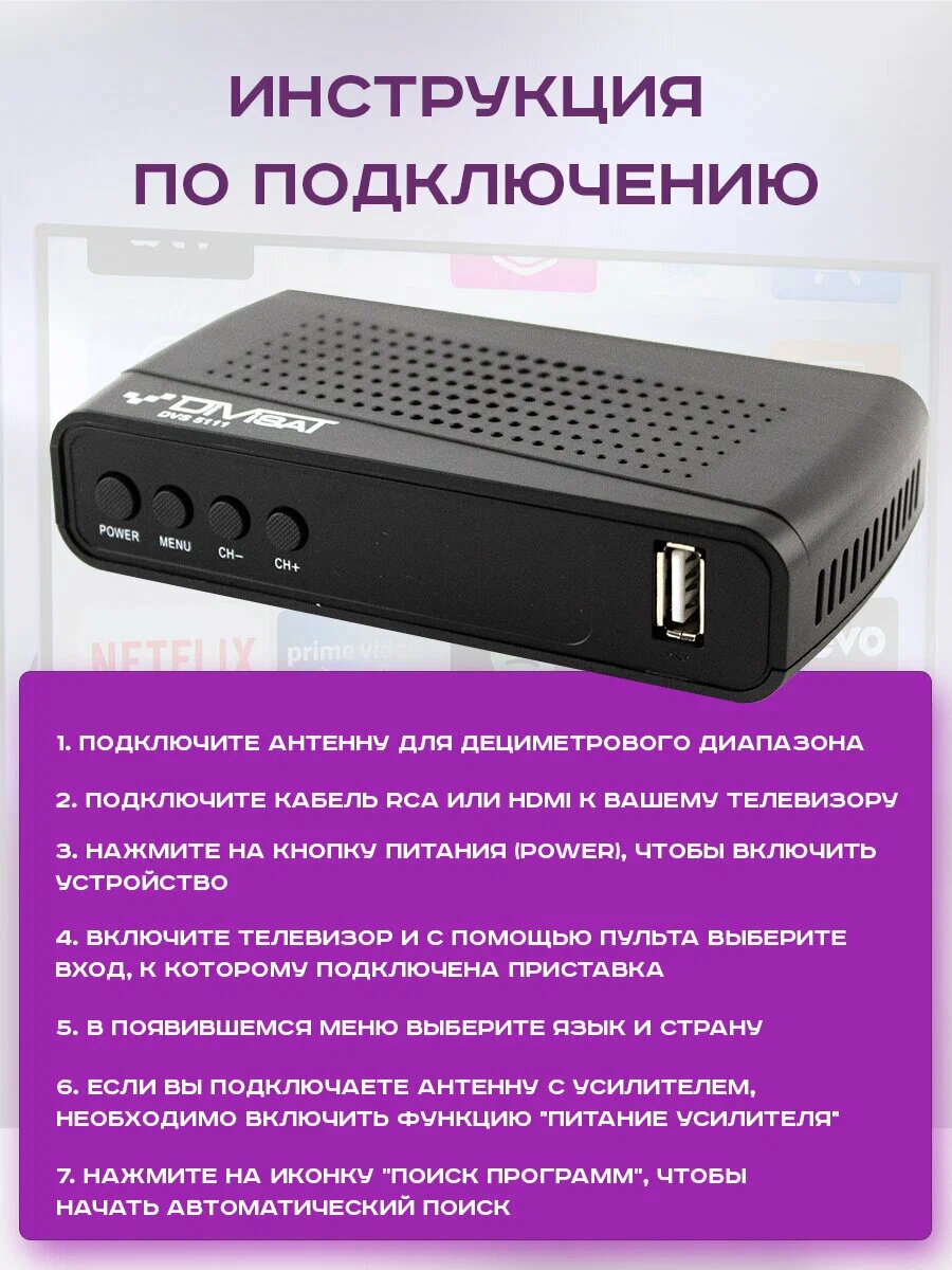 | Комплектация | Ресивер, инструкция, гарантийный талон, блок питания, провод для подключения к ТВ 3 RCA, пульт |