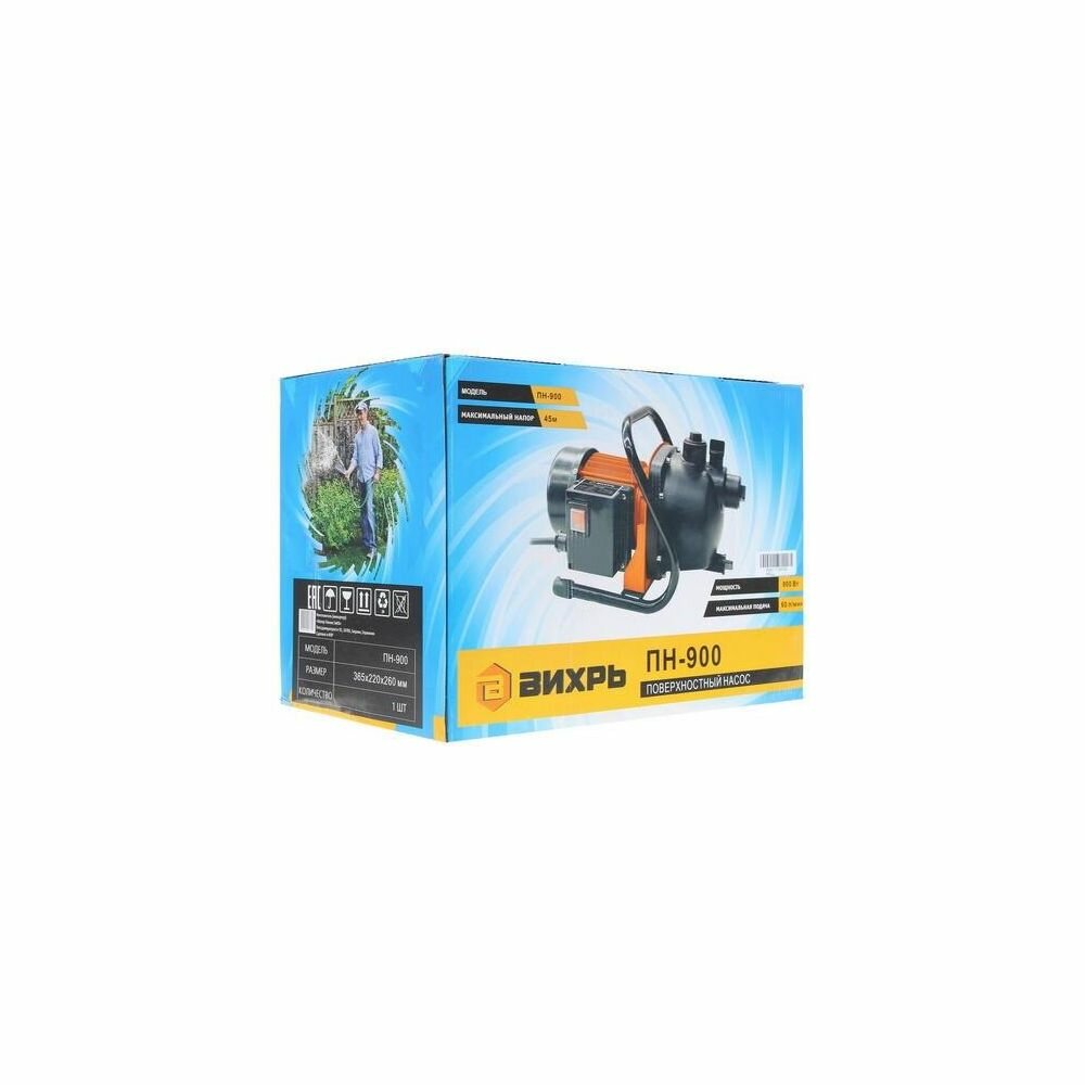 Что насос Вихрь ПН-900 качает 60 литров в минуту, производитель не слукавил. Так и есть. Уже второй сезон эксплуатирую, только этим летом на поливку огорода в день по тонне воды выкачиваю. Поломки бывают, но так как доступ облегчен, раз стоит на плоской поверхности, то устраняю тут же. Давления достаточно для наполнения высокой цистерны. Напор стабильный.