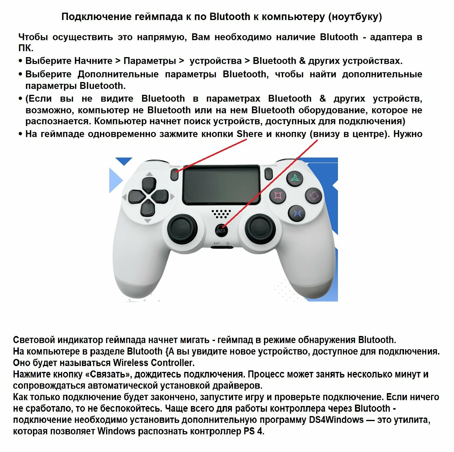 Соединяется с ПК проводом (обычный microUSB), либо bluetooth соединением практически с любым BT адаптером последних лет. Рекомендую немедленно скачать DS4 To XInput Wrapper. Эта утилитка устанавливает свой драйвер DS4. При запущенной программе контроллер работает в режиме xinput (виден любой игрой как боксовский). работает вибрация, светится и настраивается LED-индикатор, тач панель работает аналогично ноутбуковской. Словом, работает так, как должен был работать со стандартным драйвером windows, который пока так и не допилили. |