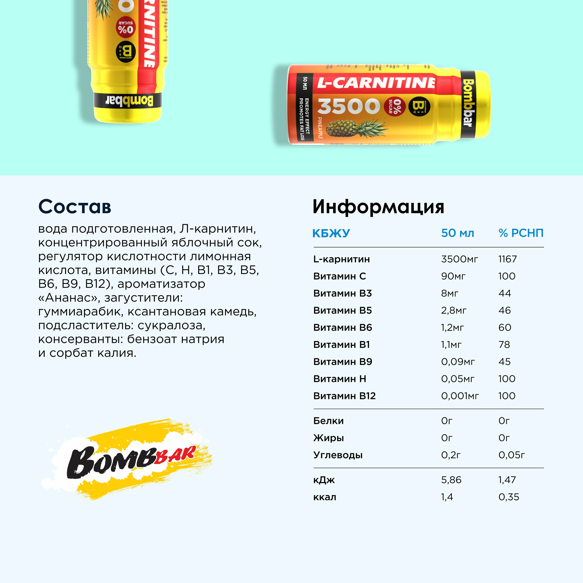 Купить Bombbar Тонизирующий напиток L-carnitine 3500 без сахара Ананас, 12шт х 50мл