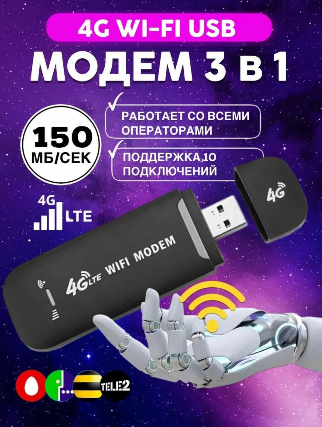 Модем Wi-Fi USB RX 150 Мб/с, LTE 2G/3G/4G универсальный, черный интересное: