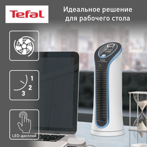 Настольный колонный вентилятор Tefal Eole Compact VF6210F0, с LED-дисплеем, таймером, автоматическим отключением, белый
