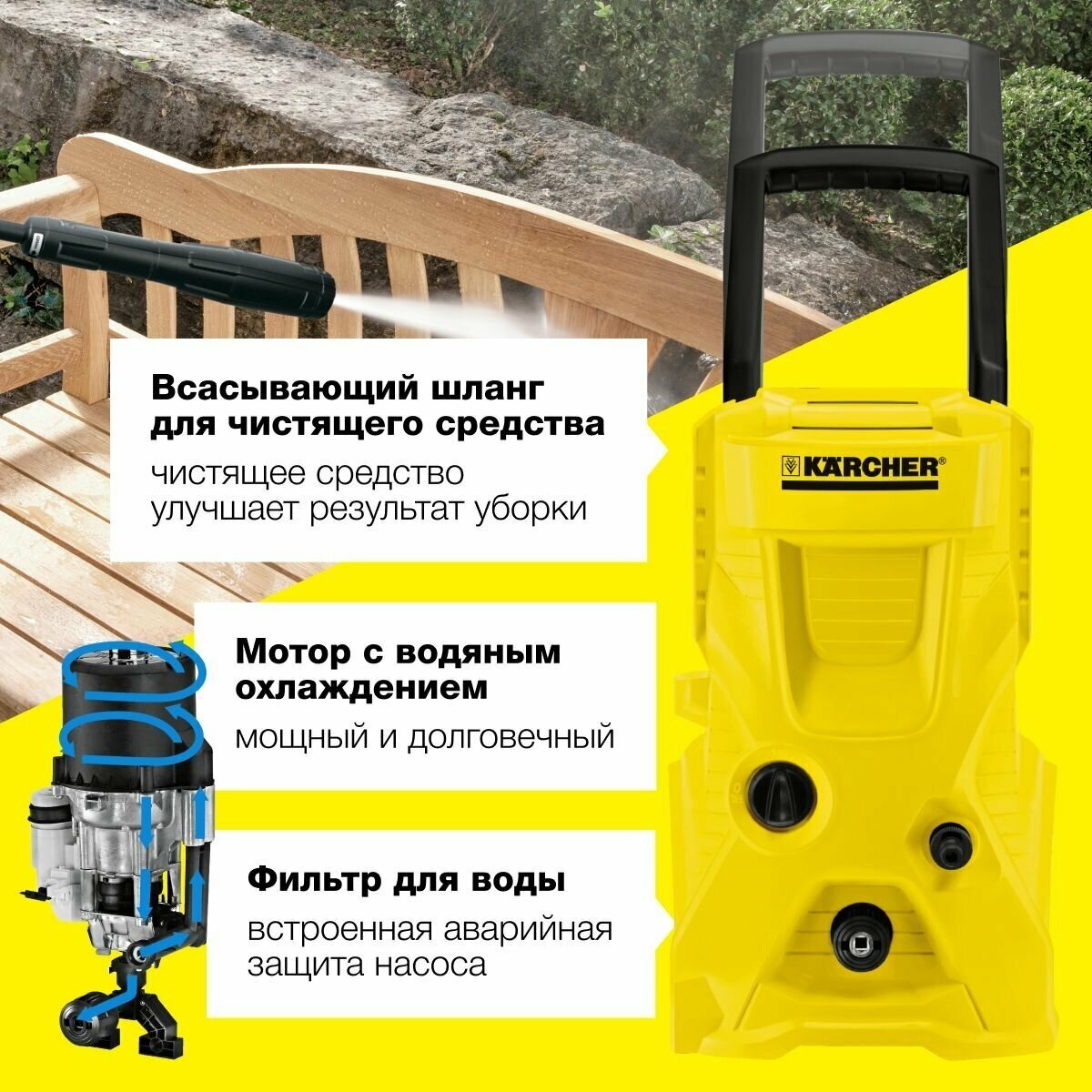 | Особенности | защита от перегрева, использование моющего средства, забор воды из емкости, фильтр тонкой очистки |