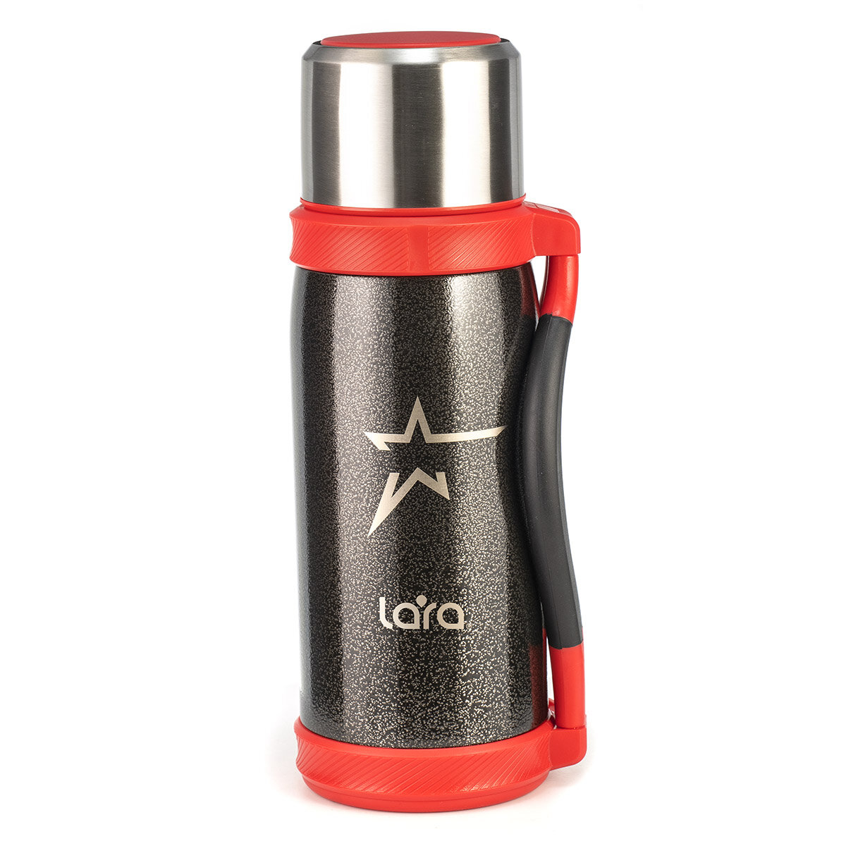 Термос LARA 1,2л молот.эмаль, крышка-стакан, черный, складные ручки