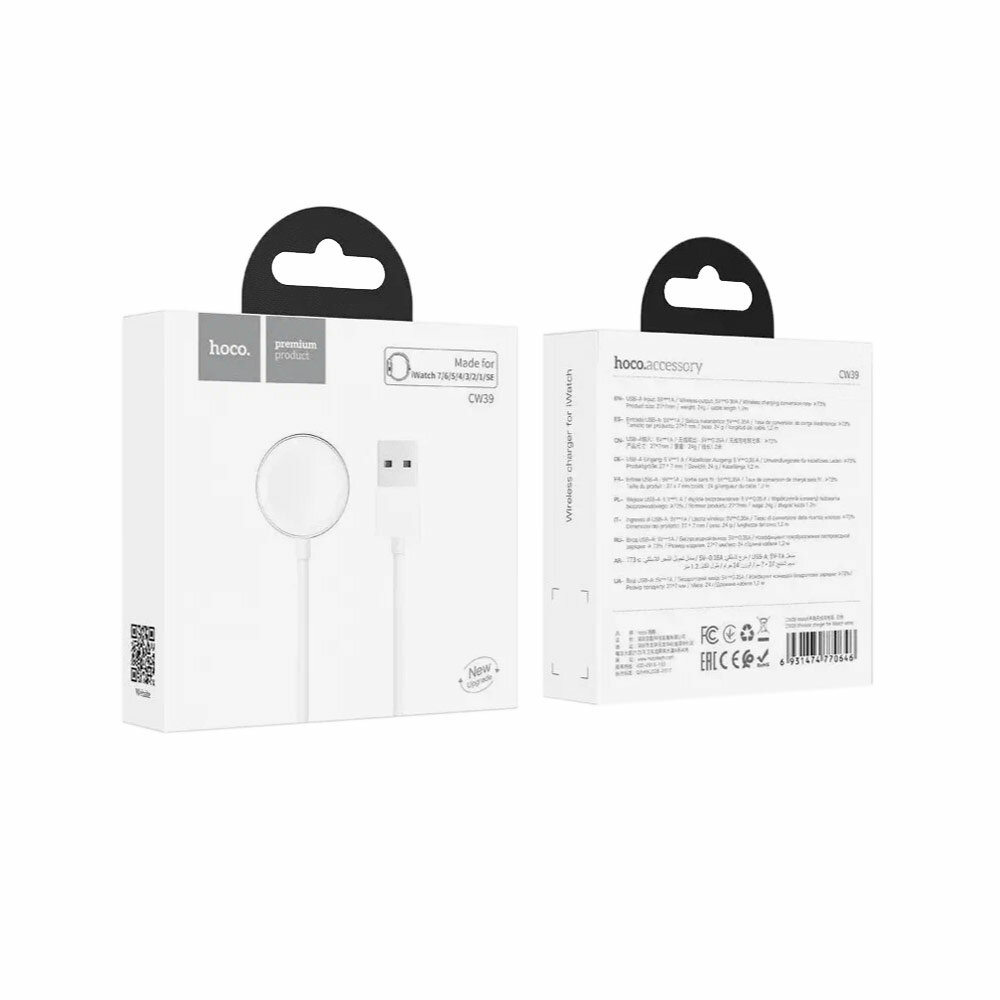 Беспроводная зарядка для Apple Watch series 1-7/SE, Hoco CW39 c кабелем USB-A, 1.2 м, Белый