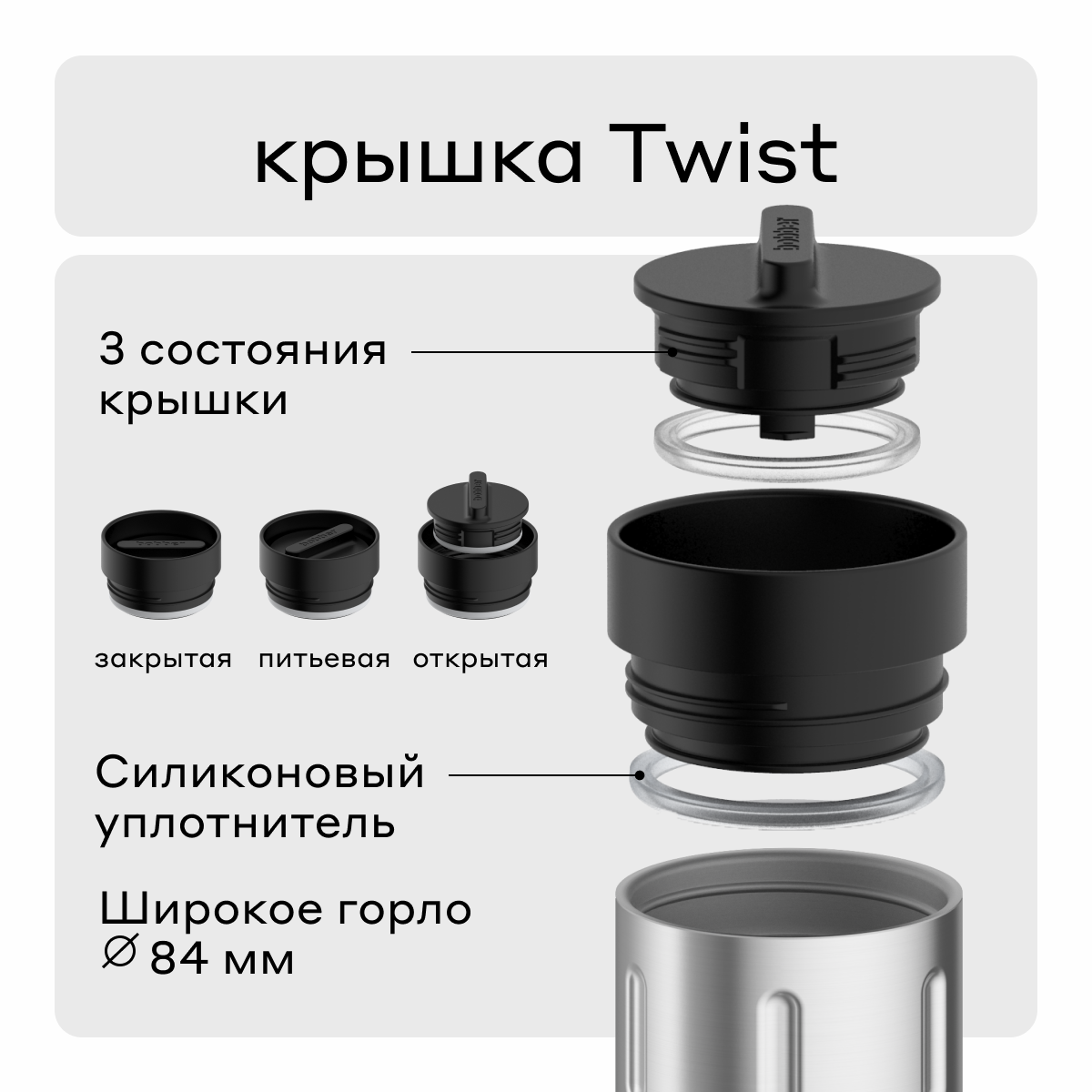 | Дополнительная информация | крышка Twist имеет три положения: 1. питьевая - прокрутите до щелчка, чтобы пить как из кружки; 2. открытая - сделайте два оборота, чтобы вытащить внутреннюю часть крышки; промойте Tumbler водой и залейте новый напиток; 3. закрытая - в таком положении температура напитка сохраняется максимально долго. Tumbler c закрытой крышкой на 100% герметичен. |