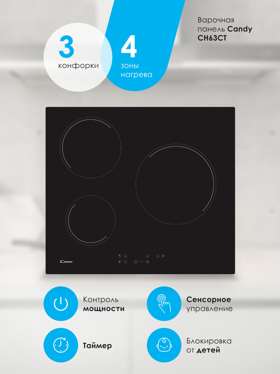 Электрическая варочная панель Candy CH63CT, стеклокерамика, 3 конфорки, блокировка управления
