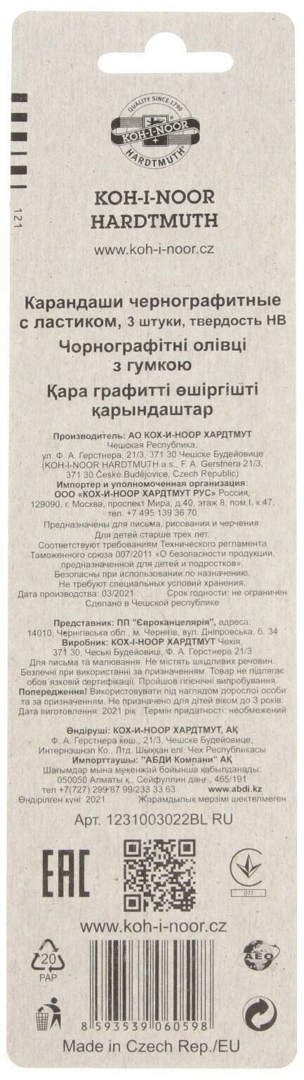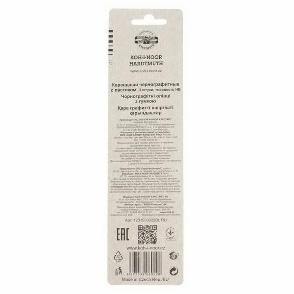 Карандаш чернографитный Koh-I-Noor Mix 1231 1231003022BLRU HB шестигранный дерево ассорти блистер (3 штуки) ластик