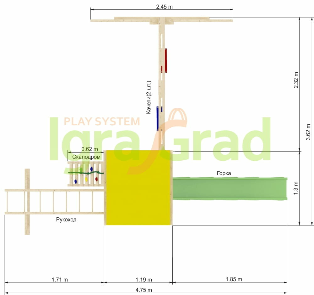 | Комплектация | подвесные качели с пластиковыми сидениями, песочница, лесенка, горка, канат,столик,рукоход |