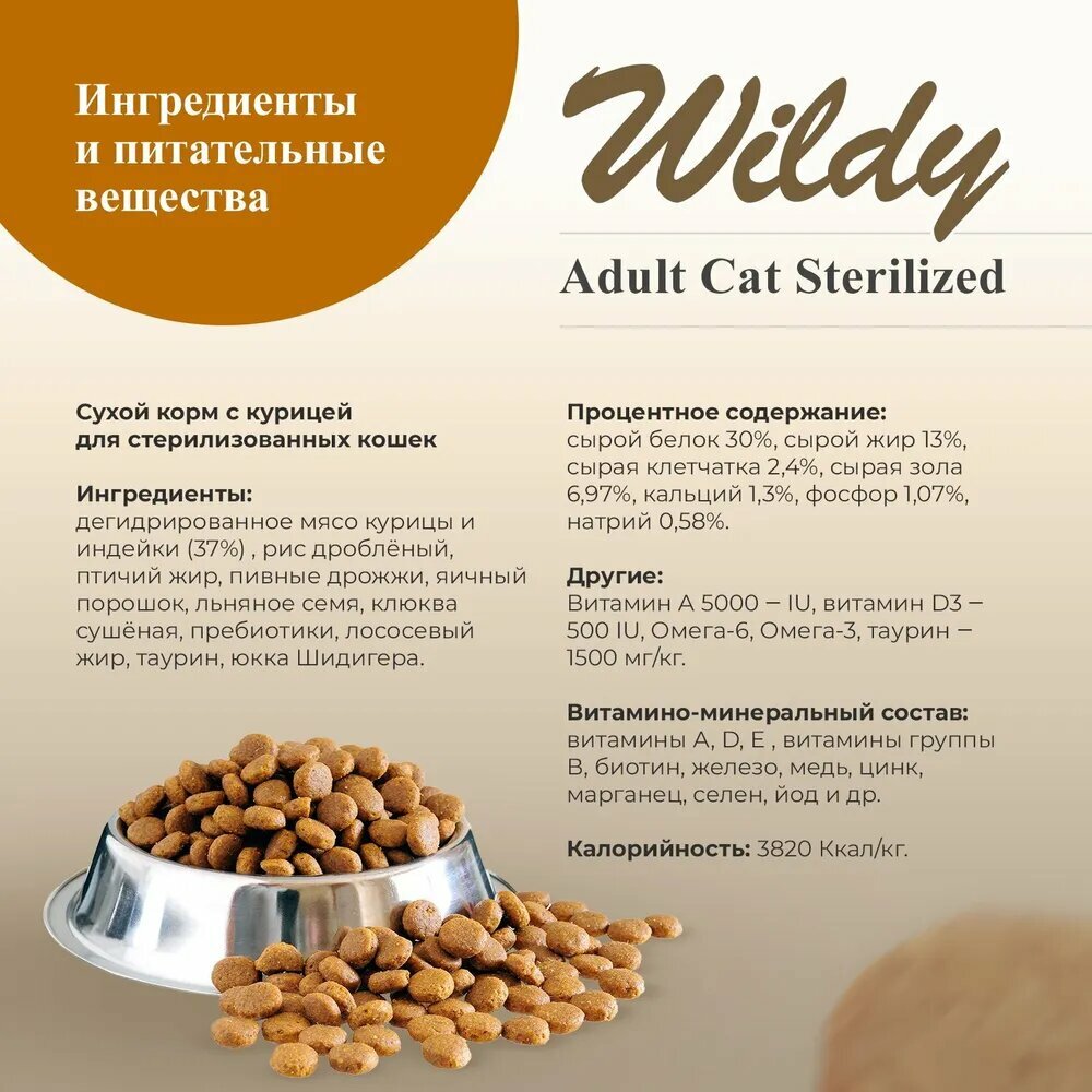 WILDY ADULT CAT STERILIZED для взрослых кастрированных котов и стерилизованных кошек с курицей (3 кг)