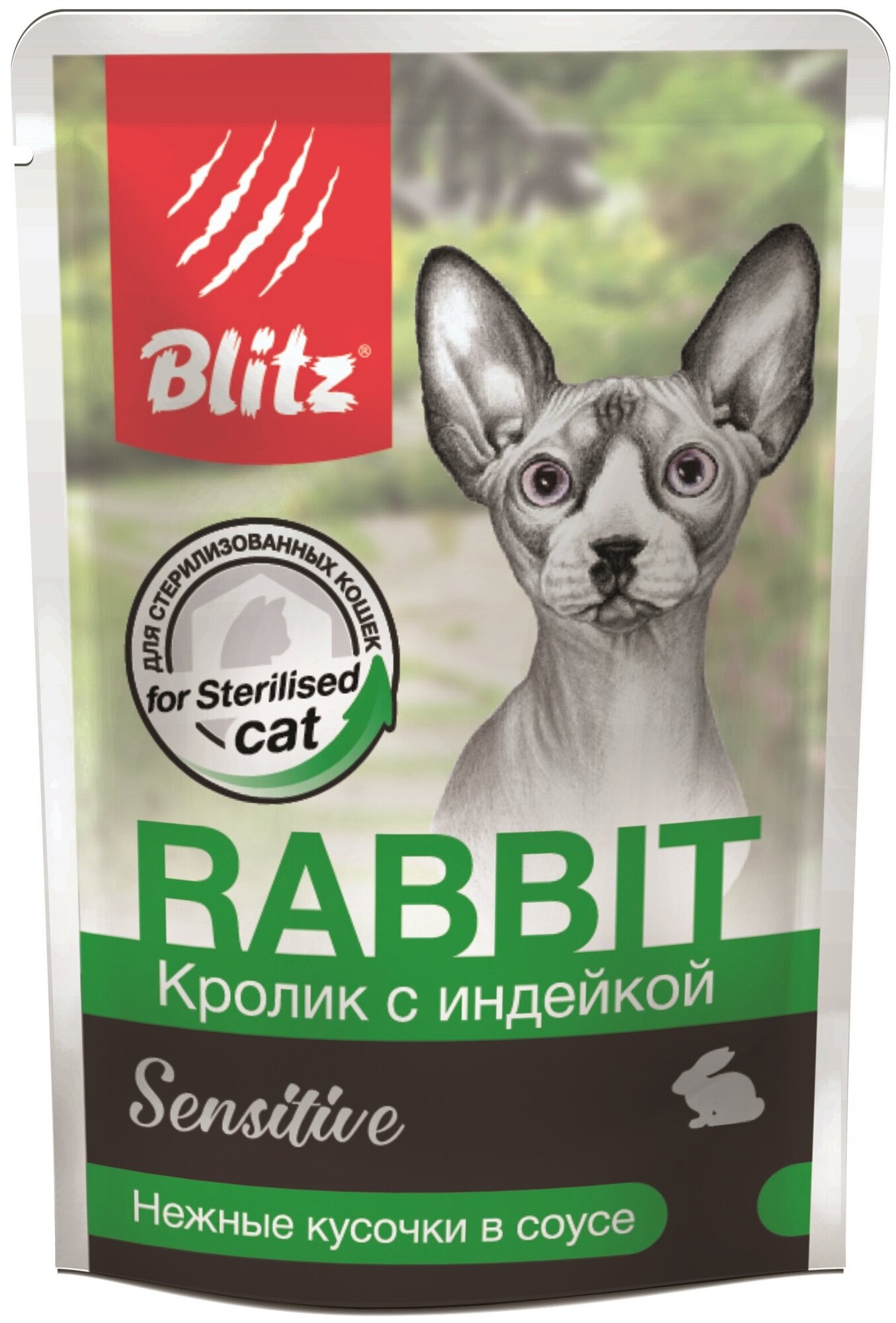 BLITZ SENSITIVE для взрослых кастр котов и стерил кошек с кроликом и инд в соусе пауч 85 гр 85 гр х 4 шт