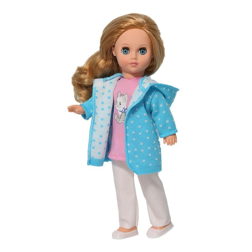 | Комплектация | кукла, вязаное пальто с капюшоном и застежкой сверху, трикотажные брюки, розовая футболка с термоаппликацией "Котенок", трусики, пластмассовые туфельки |