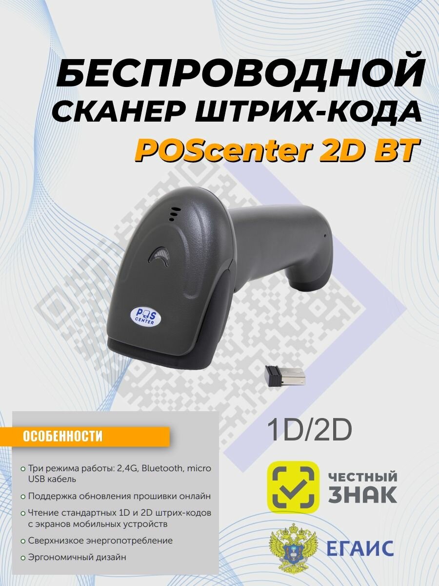 СохранитьСканер штрих-кода Poscenter 2D, беспроводной, чёрный, USB кабель, USB адаптер интересное: