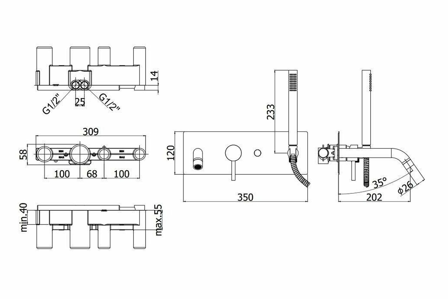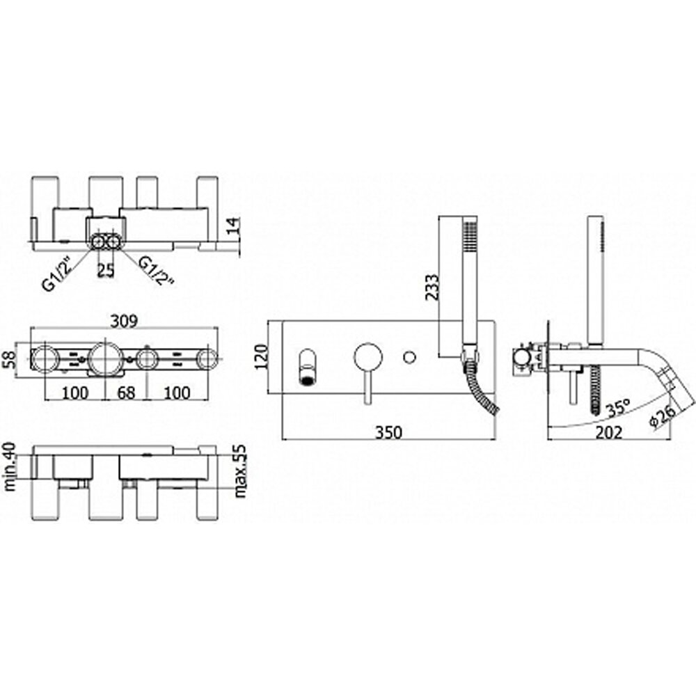 | Дополнительная информация | Смеситель для ванны встраиваемый на 2 выхода, накладка из нерж стали 350х120мм, душ гарнитур MASTER из металла, девиатор-кнопка |