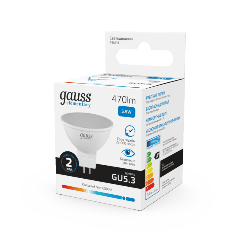 (1 шт)Лампа Gauss Elementary MR16 5.5W 470lm 6500К GU5.3 LED 1/10/100